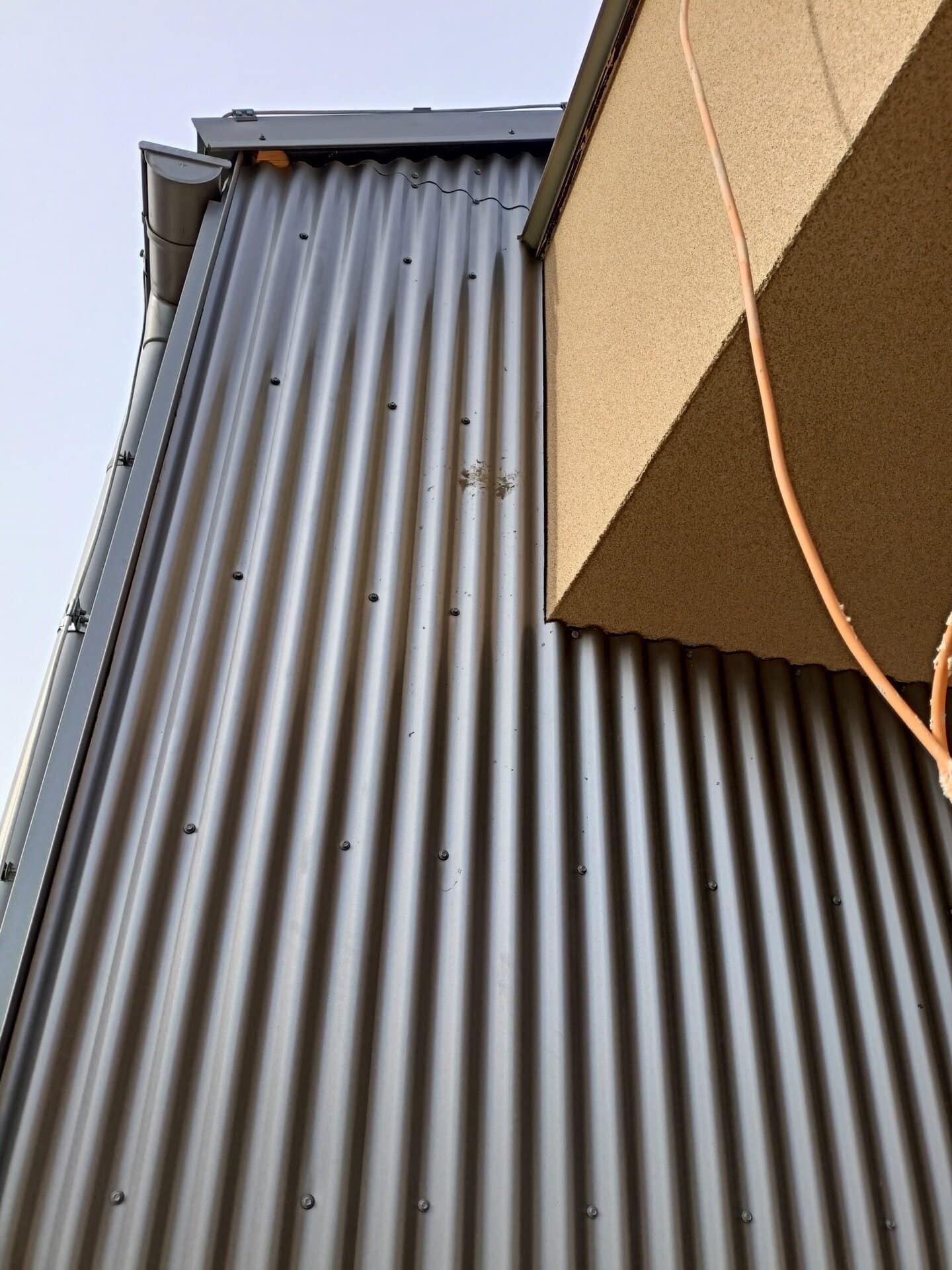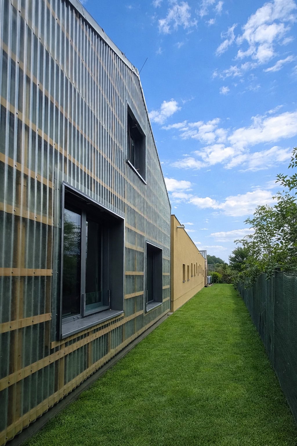 Fasádní plášť je tvořen netradiční kombinací tří obkladových materiálů – modřínových hranolů A/B 20 × 70 mm, vlnitého plechu v odstínu RAL 9007 a sklolaminátových vln. Tato kombinace dodává budově jedinečný vizuální charakter a zároveň umožňuje vytvořit dynamickou a hravou kompozici odpovídající prostředí školského zařízení.