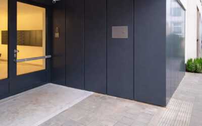 Na bytovém domě byla realizována provětrávaná fasáda z kompozitních desek Albond, použitá v oblasti hlavního vstupu a meziokenních vložek.