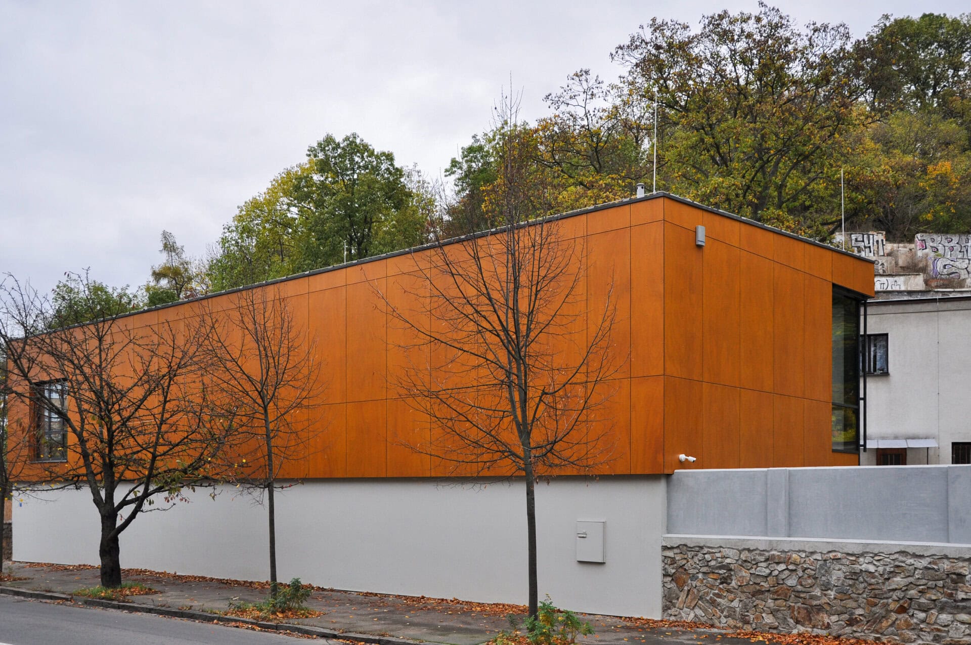Mateřská škola s provětrávanou fasádou z kombinace dřeva, plechu a sklolaminátu
